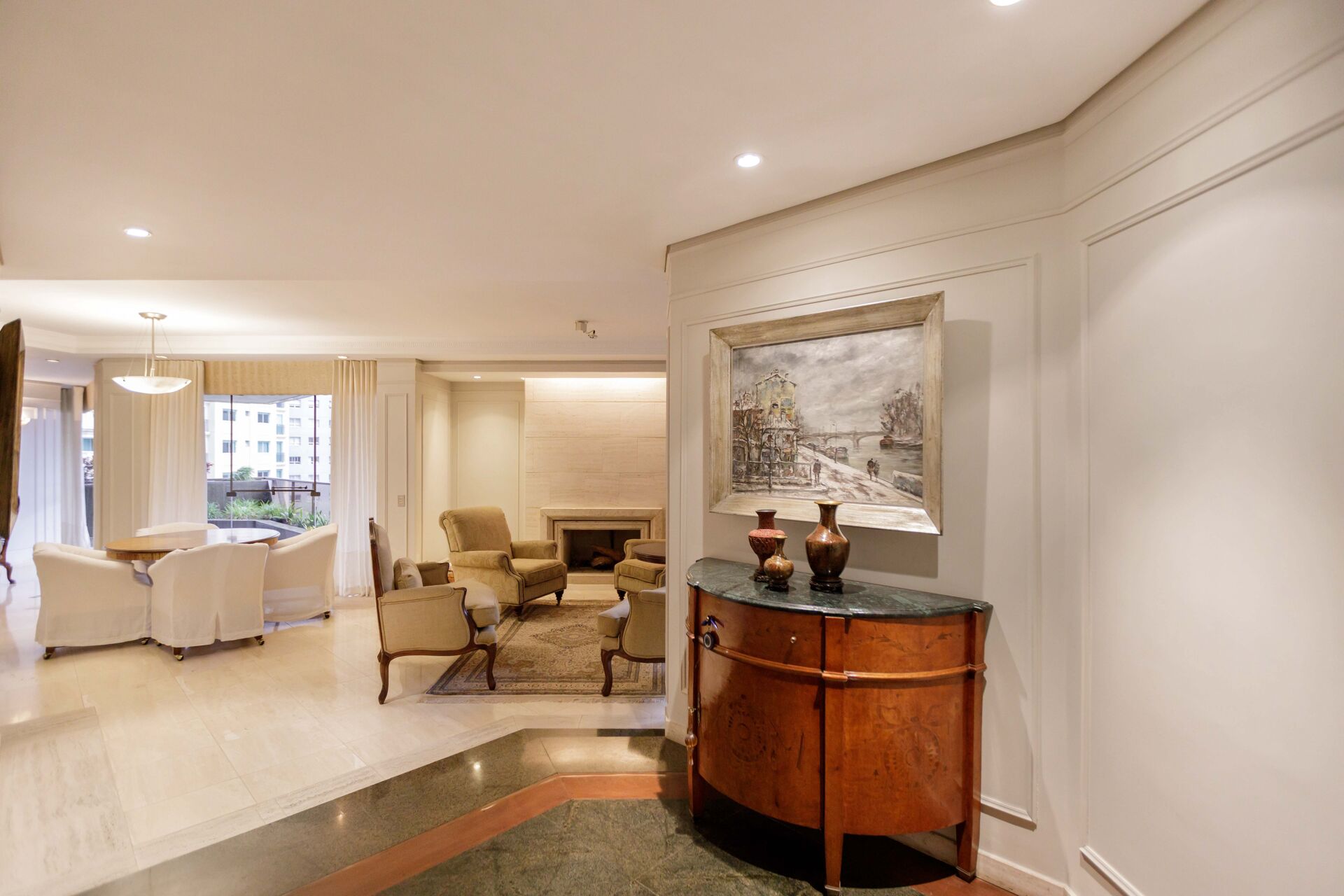 Composto por sala para 3 ambientes com piso em mármore, lareira, lavabo, copa, sala íntima, escritório e quatro suítes, sendo duas master com closet.