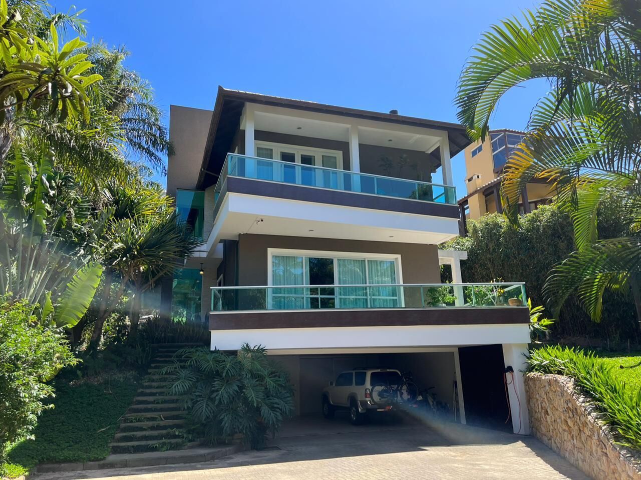 Os ambientes amplos e integrados convidam a desacelerar: salas acolhedoras com lareira, cozinha funcional e dormitórios bem distribuídos, incluindo uma suíte master com closet, chuveiro duplo e vista parcial para o mar.